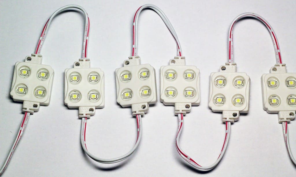 Диоды, которые устанавливают в вывесках, одинаковы, но тип корпуса для диодов влияет на срок службы модуля. Если вывеска интерьерная, можно использовать светодиодную ленту — это дешевле. Если реклама наружная, устанавливают только светодиодные кластеры, потому что в них не попадает влага.